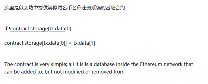 身份和信誉系统最早的替代币,域名币,尝试使用一个类比特币块链来提供一个名称注册系统,在那里用户可以将他们的名称和其它数据一起在一个公共数据库注册。最常用的应用案例把象“bitcoin.org“(或者再域名币中,”bitcoin.bit“)一样的域名与一个IP地址对应的域名系统。其它的应用案例包括电子邮件验证系统和潜在的更先进的信誉系统。这里是以太坊中提供与域名币类似的的名称注册系统的基础合约: